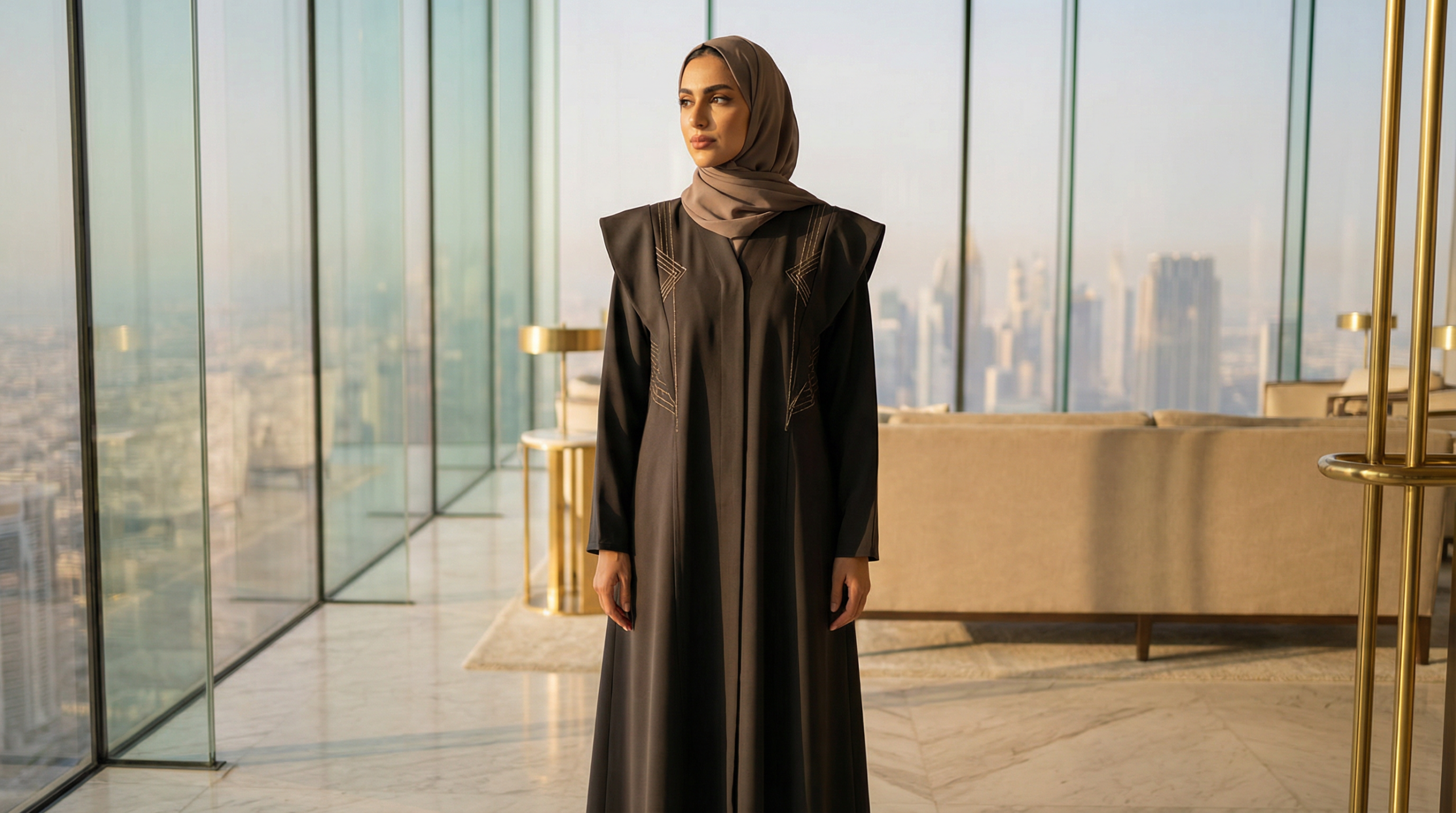 Monochromatic dressing dominates the scene, with head-to-toe black, ivory, and camel looks elevated through texture play. Luxurious silk crepes, lightweight wool blends, and technical fabrics create dimension without relying on color contrast. Layering has become an art form, with tailored blazers over flowing abayas and statement outerwear transforming traditional pieces into fashion-forward ensembles.