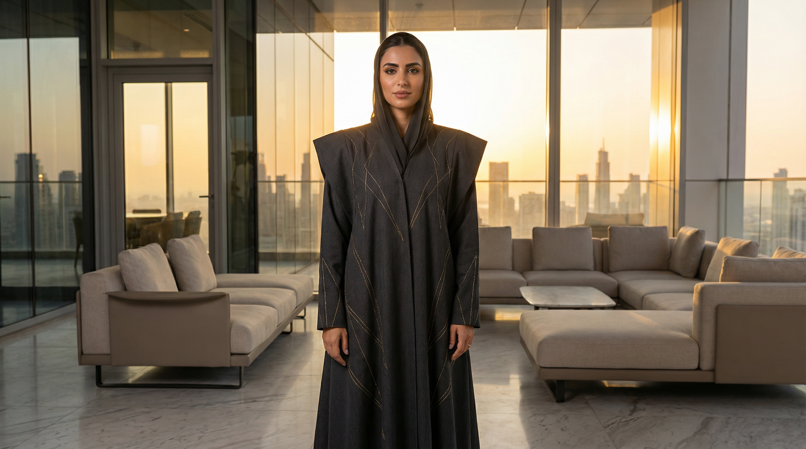 Monochromatic dressing dominates, with black, white, and grey creating clean, commanding silhouettes. Abayas feature tailored cuts reminiscent of business suiting, with structured shoulders and crisp lines. Accessories lean minimal—quality leather bags, elegant watches, and subtle jewelry convey success through restraint.
