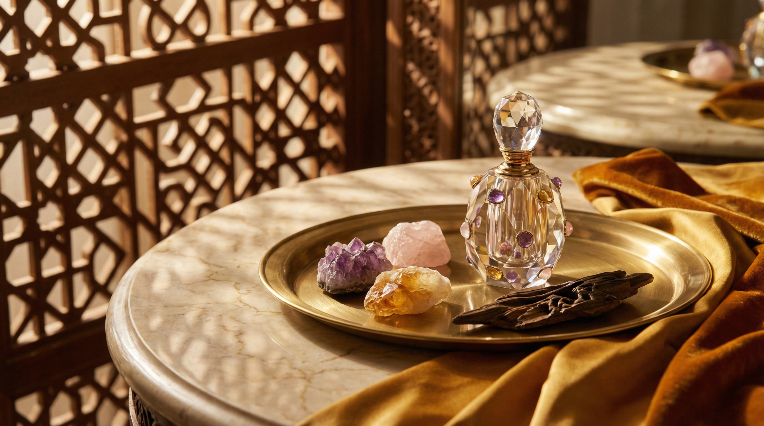 Rose otto, one of the most precious essential oils, opens the heart chakra and promotes self-love and compassion. Jasmine, celebrated throughout Arabic culture, stimulates the sacral chakra, enhancing creativity and sensuality. These oils, when combined with gemstone essences, create synergistic effects that amplify their energetic properties.