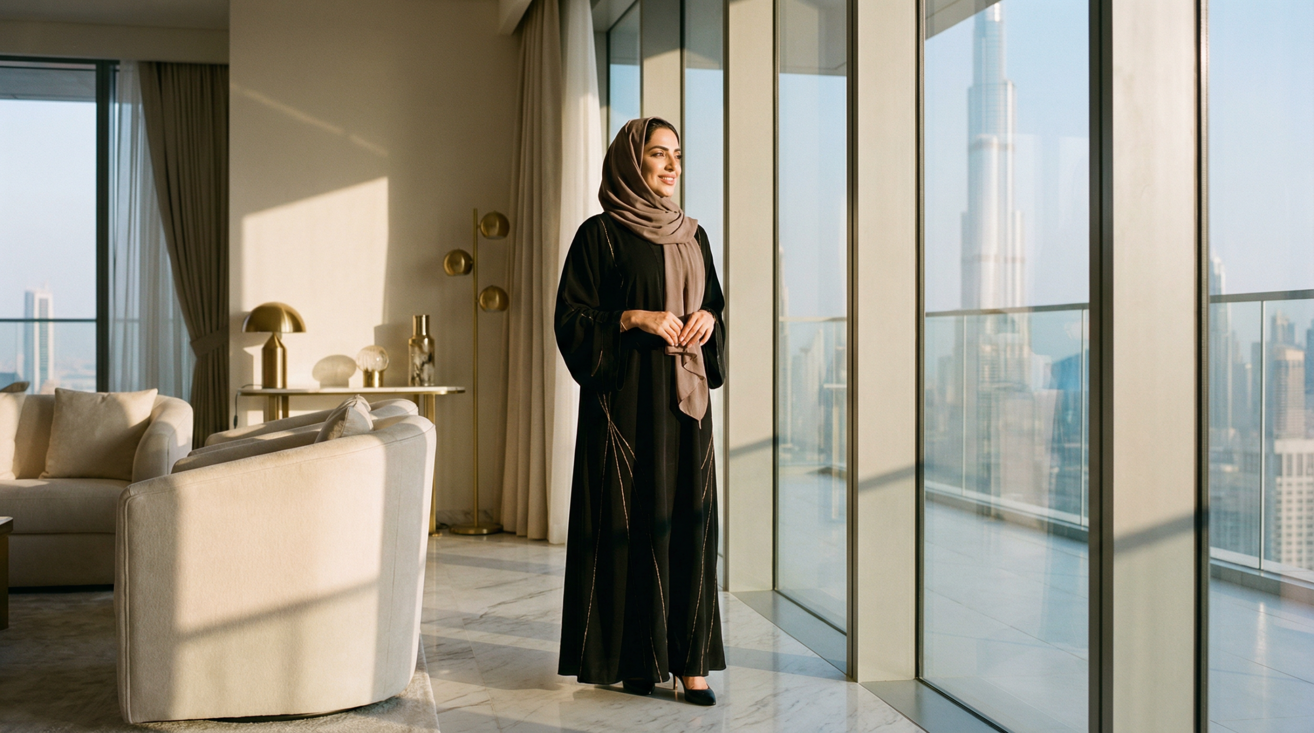 Look for breathable fabrics like quality Nida or lightweight crepe that withstand the Gulf heat and frequent washing. The cut should allow easy movement while maintaining a polished silhouette. Neutral tones—black, navy, charcoal, or soft beige—offer maximum versatility and pair seamlessly with any footwear or accessories.