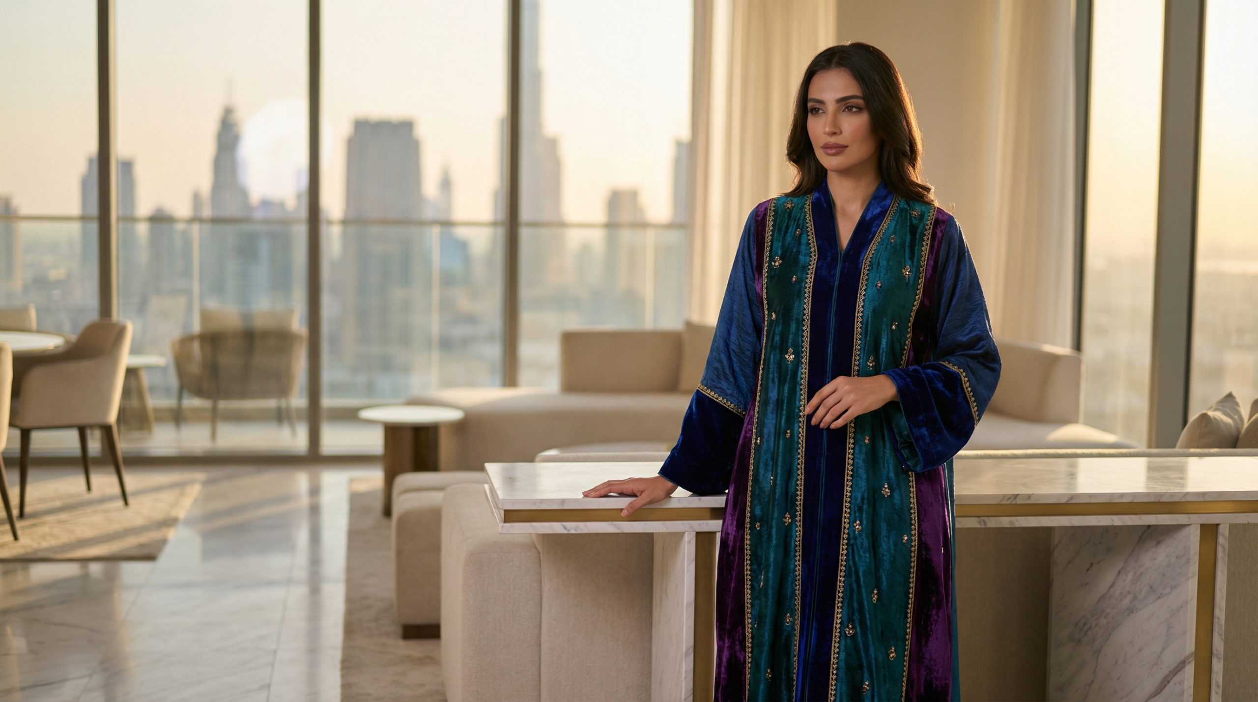 Choose an open-front abaya in taupe or warm beige, revealing a coordinating midi dress underneath. This layering technique adds visual interest while maintaining modesty. Look for subtle embossed patterns or jacquard weaves that catch light beautifully in indoor settings.