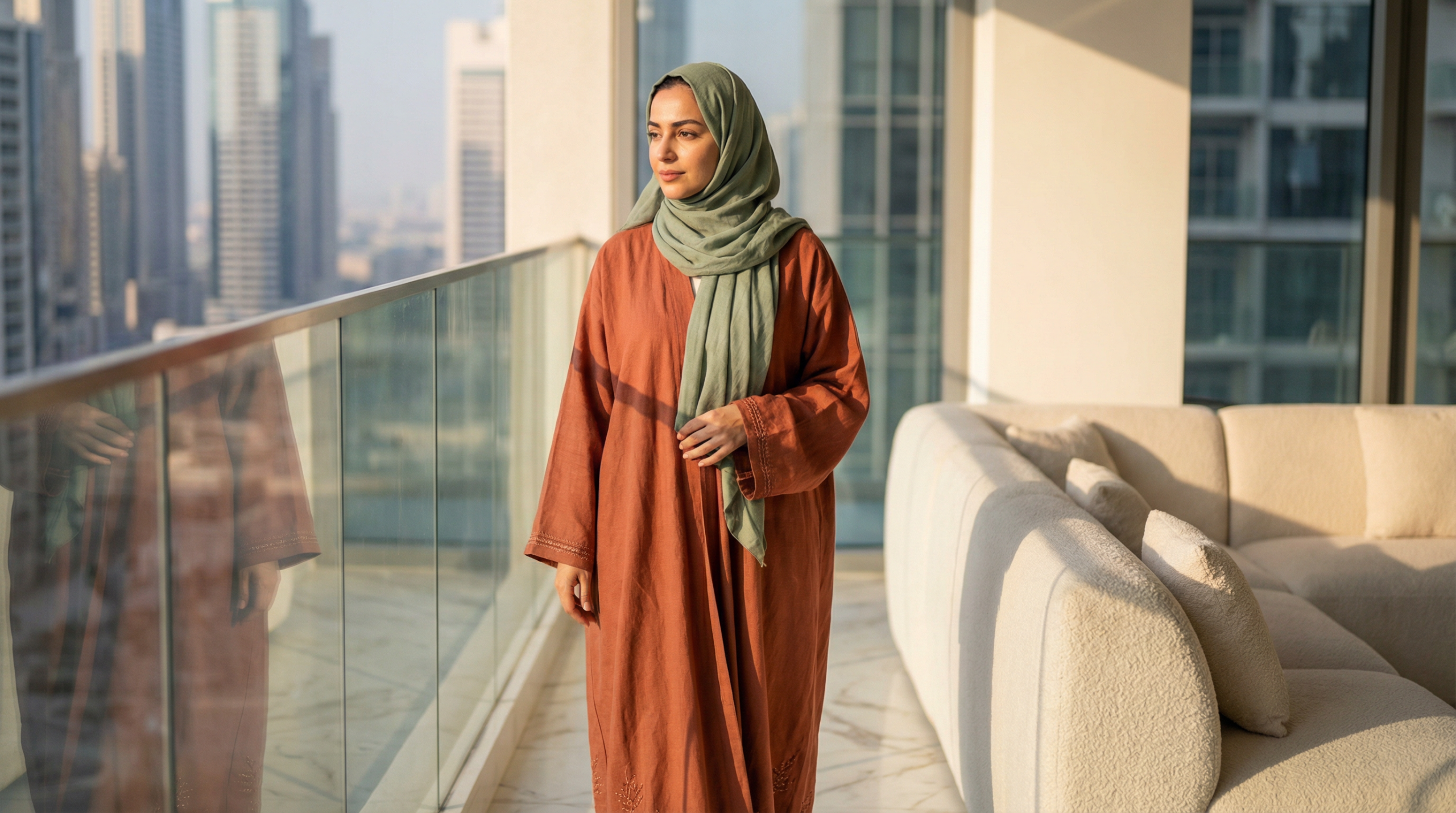 Think beyond traditional black abayas and explore earthy tones like terracotta, sage green, and warm beige. These shades photograph beautifully against gallery walls and evoke the creative, bohemian spirit of artistic spaces. The key is appearing thoughtfully dressed without seeming overly formal or contrived.