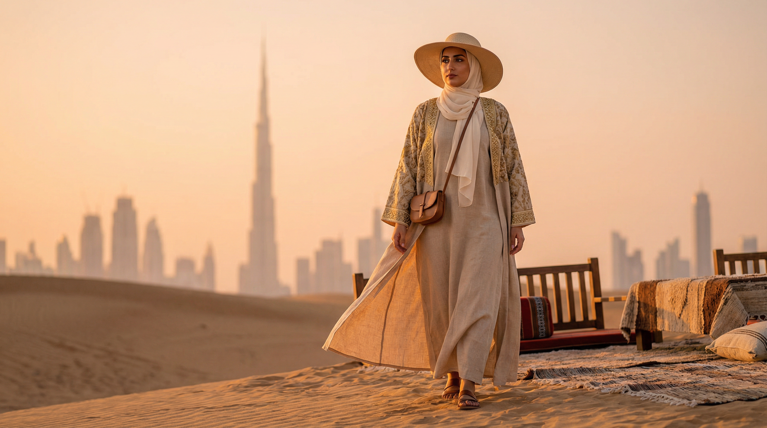 Wide-brimmed hats have become essential for desert outings in 2026. Choose structured styles in neutral tones that complement rather than clash with your abaya. The key is selecting brims wide enough to protect your face and neck but not so dramatic that they catch wind.
