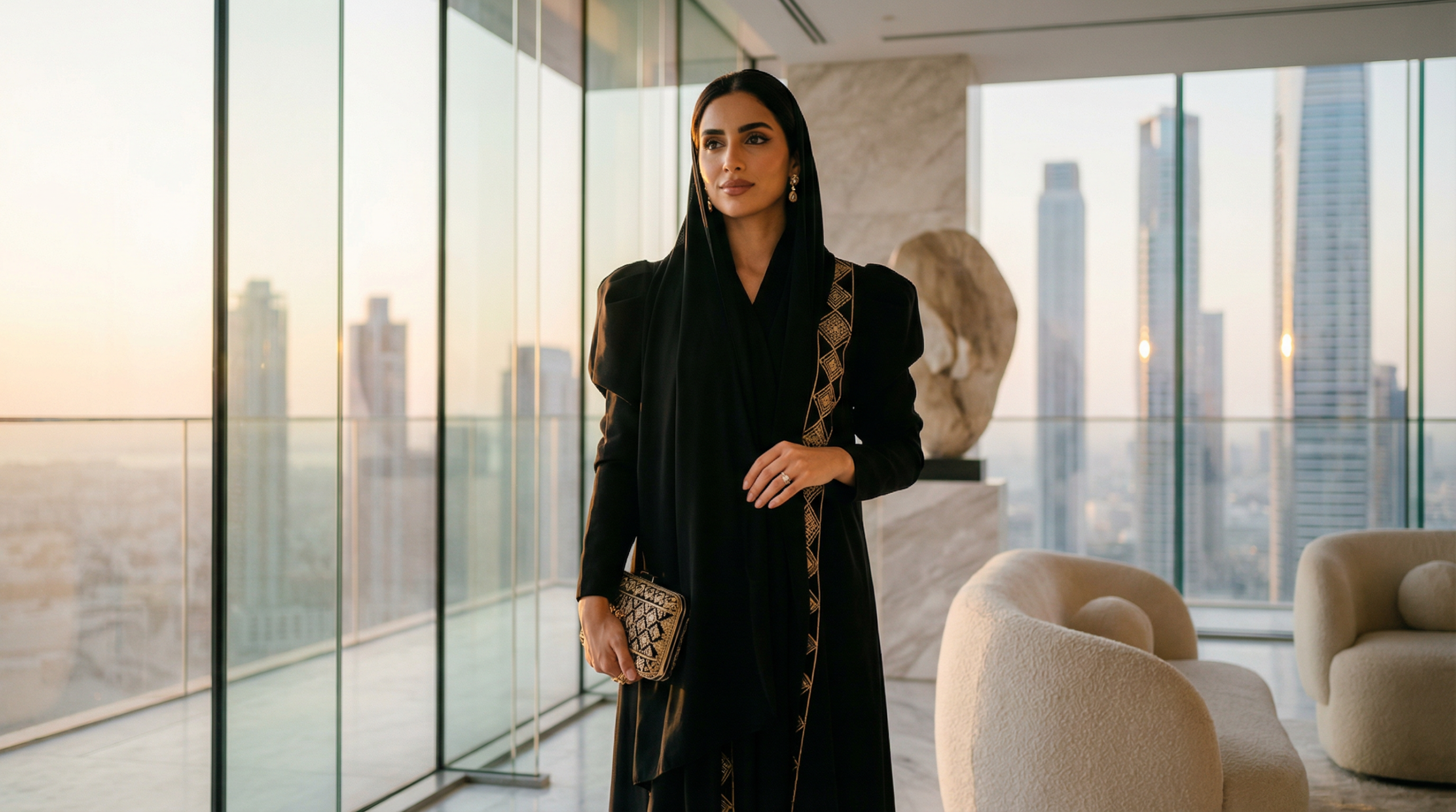 Accessorize with modern minimalist jewelry—geometric shapes in brushed metals work particularly well. Choose a structured handbag in a bold color that coordinates with your abaya’s accents. Ankle boots or modern loafers bring an urban edge.