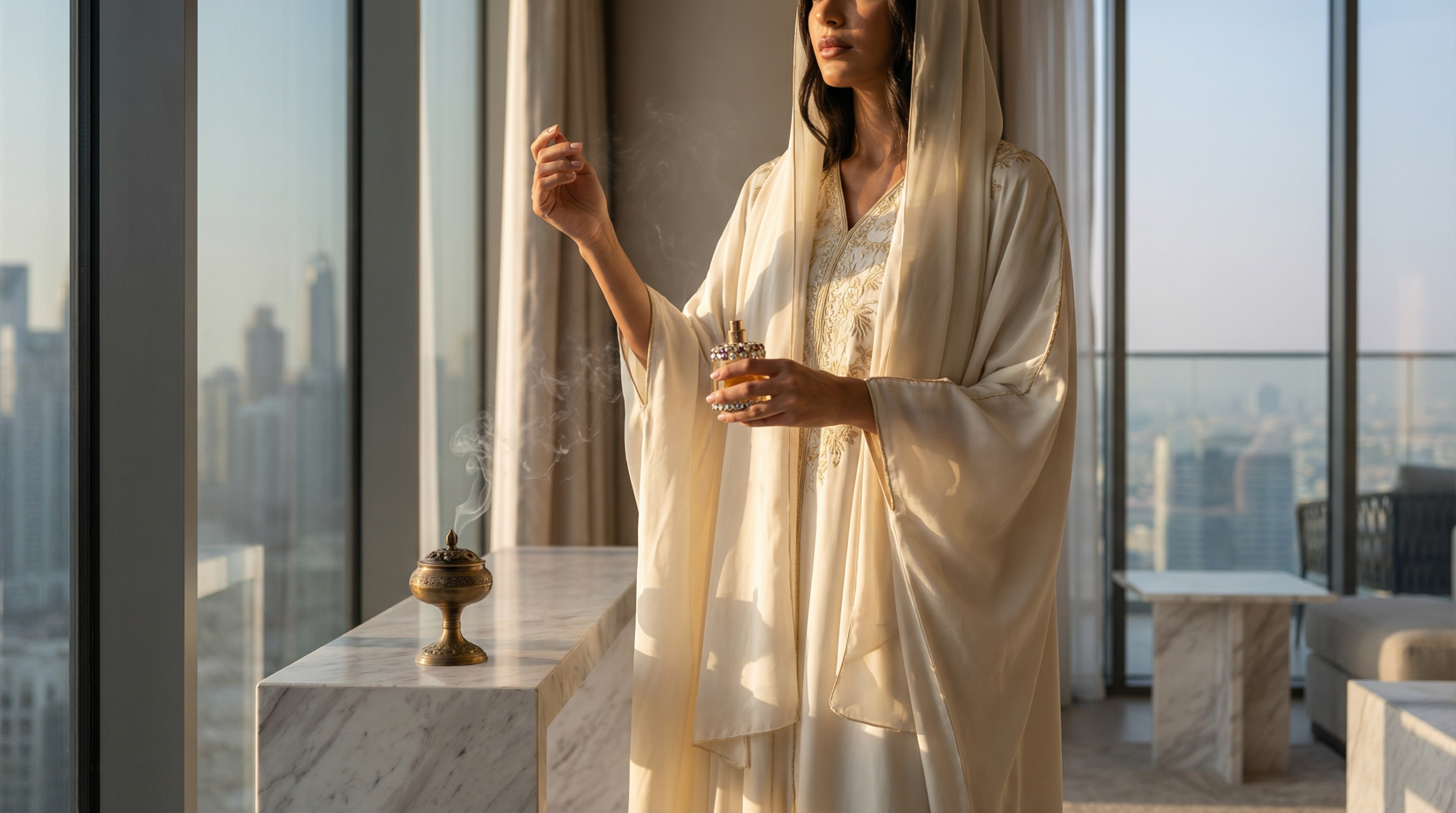 Traditional Arabic perfume formulations—oil-based attars, pure oud, concentrated parfums—work superior to alcohol-heavy Western fragrances for abaya wear. These concentrated oils apply to skin rather than fabric, providing eight to twelve hours of development as they interact with body chemistry.