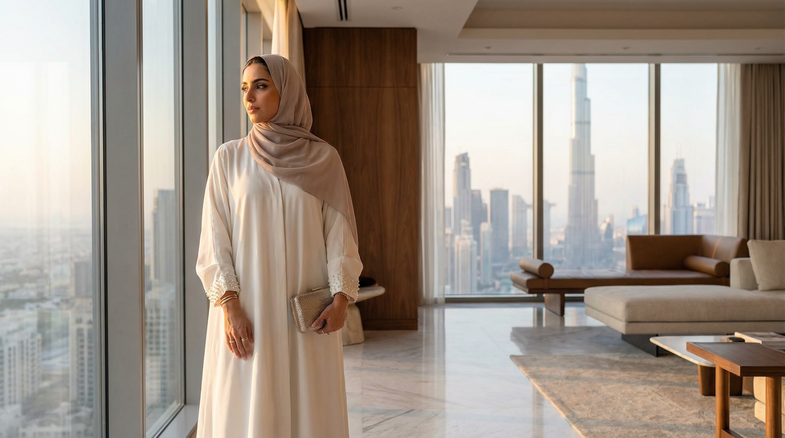 Accessories transform a simple Cloud Dancer abaya into a statement of personal style. The cultural context of the GCC demands both elegance and appropriateness, creating an interesting balance for the modern Muslim woman.